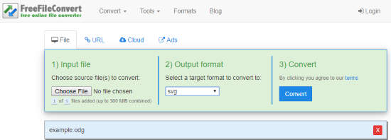 You may open the link which I’m mentioned below. The links will take you to the website from where you can convert files online. To convert the ODG file, you need to import the input file. After this, you can choose the desired format, ie., SVG. And then, you can start the file conversion and download the output of SVG file.