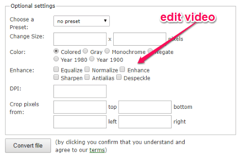 Video Converter (by AConvert) is another simple video to GIF converter which lets you easily turn any video into a GIF file. What makes this website more useful is that it lets you do some editing to the video before the conversion. You can change various aspects lie size, frame rate, etc.