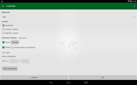 Alerts are highly customizable, as you can see from the image above. They can be filtered based on magnitude and location. Available notifications include sound notifications, vibrations (based on earthquake strength) and lights. Small drawback of this app is that it focuses mainly on the US (only major earthquakes from around the world are going to be reported), seeing how alerts are pulled from the USGS website.