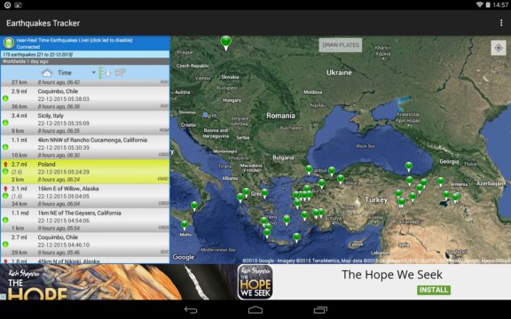 What makes Earthquakes Tracker interesting though is its main control panel, which you can see on the image above. There’s a map with a list of all the earthquakes that have happened that day. Map has an option called “plates” which outlines tectonic plates. Big plus for Earthquakes Tracker is that it reports on earthquakes from around the world.
