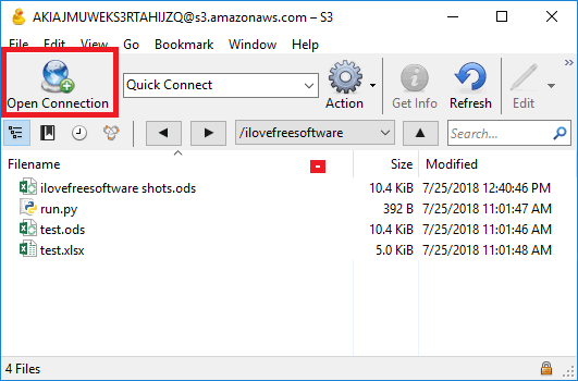 For Windows, Cyberduck comes as a Windows 10 app and as a software for other version of Windows. You can install it according to your choice using its homepage. Next, install it and then open it up. Add a cloud account in it by clicking on “Open Connection” from the toolbar. After that, choose S3 from the list and specify the API key and API secret to connect to your account. After validating the keys, it will show you the files and folders from your S3 bucket. After that, you can do anything you want. You can upload files from your PC and download files from the cloud. Also, you can manage the files already in the cloud by renaming, deleting them.