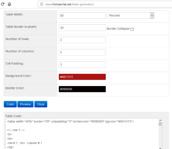 If you need something very simple for HTML table generation, then this HTML Table Generator website (Homepage) is handy. It has only main features that are needed to generate a good-looking HTML table. You can set table width, table border width (in pixels), number of columns and rows, set cell padding, table background color, and border color options. These are the options you can use to generate HTML table using this website.