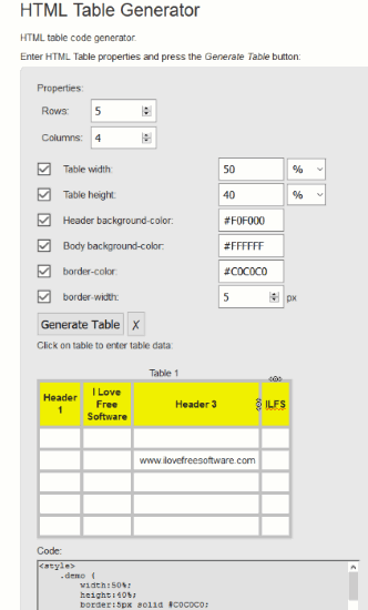 HTML Table Generator (Homepage) is one of the best websites here to generate HTML table with ease and get the output code. It comes with a basic interface but the options provided by this website are very good. You can select number of rows and columns as per your wish, set the table width n height, header background color, border style (solid, dotted, groove, ridge, inset, etc.), border width, border color, border spacing, text alignment (left, center, or right), etc. Set the options and then you can generate HTML table. You need to scroll down its webpage to check the output table preview and get HTML table code.