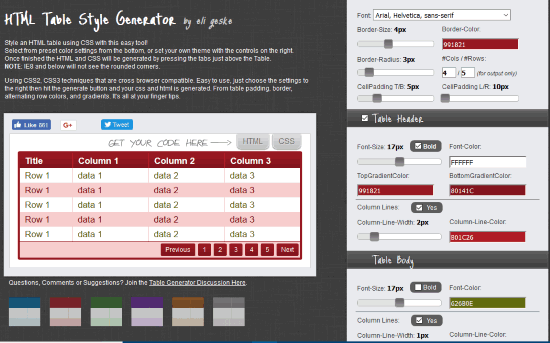 HTML Table Style Generator (Homepage) gives a good competition to rest of the HTML table generator websites available in this list. It lets you customize HTML table using the available options and preview the output table with changes visible in real-time. There are 6 different color schemes also available for HTML table. Once the table is generated, you can get its HTML code as well as CSS code. You can’t add custom text but preview output table with demo text. Also, it won’t help you split or merge table cells but other options are good.