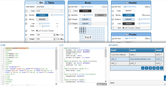 Apart from that, it has many interesting features. You can set border width for HTML table, border color, text font, header font size, footer font size, color, links color, cell and padding height n width, column dividers width, show/hide demo text, etc. Separate sections are available for table, header, footer, and body options. This makes using this HTML table generator website extremely simple. I like this website very much.