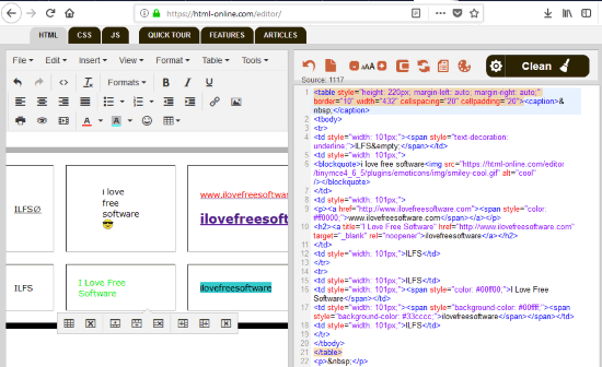 Online HTML Editor is the most powerful and advanced HTML table generator website in this list. It has numerous features. Almost all the options that are needed to generate the desired HTML table are available in this website. You can create table by hovering mouse cursor on row and column table chart, add custom text in the table cells, and do many other things.