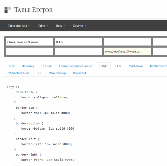 Table Editor website also gives some good options for generating HTML table. Like many other websites, it lets you select rows and columns for your HTML table by hovering the mouse cursor on the table chart. After that, you can add custom text in the cells of table. You can also delete a row, duplicate a row, move a row up/down, and add a new row above or below a row. For columns, it lets you increase/decrease column span, sort columns alphabetically or numerically, align text (left, center, or right), etc. For table, it also lets you show/hide table header, remove all borders, invert table, search and replace a particular text in table, add borders around (removing borders between columns and rows), add vertical borders (for columns only), etc. So, pretty good options are available to create HTML table.