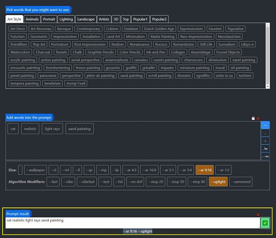 Just click on the link below and describe the main subject / idea of the image in the white textbox. Observe that the tool has hundreds of modifiers for animals, anime, artists, camera angles, shapes, material, texture, style, location, lighting and more. Just click on the modifier button and then click on the back or front arrow under the representative image to use the modifier in the prefix or postfix of the text prompt respectively. You can also choose the keyword delimiter using the ‘Commas’ dropdown. Since each modifier is accompanied with an image, it makes it easy for you to judge the likely outcome of the image generation.