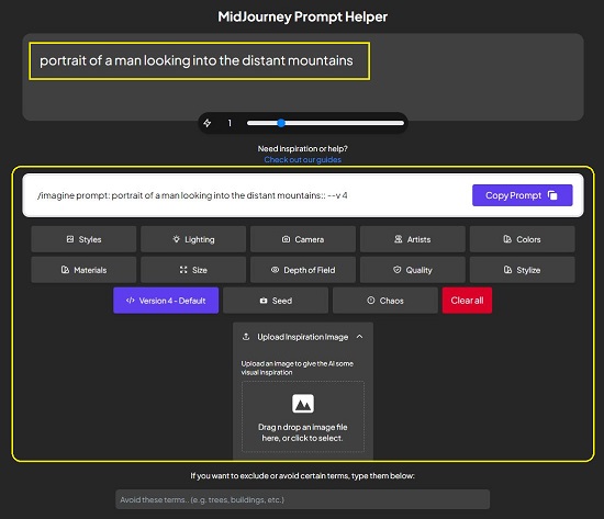 MidJourney Prompt Helper provides options that cover most of the important parameters such as lighting, camera type, colors, materials, quality and more. It also provides options to stylize the image, supply negative prompts as well as upload an inspirational image. Due to all these features, you no longer have to type out all the required options to build the text prompt as the tool automatically does it for you thereby saving time, preventing errors and resulting into a detailed and precise image.