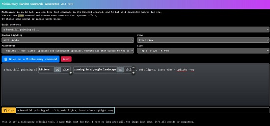 You will observe that the text prompt is built in real time. Once the image has been described all the parameters have been specified just copy the prompt and use it in MidJourney to create your images.