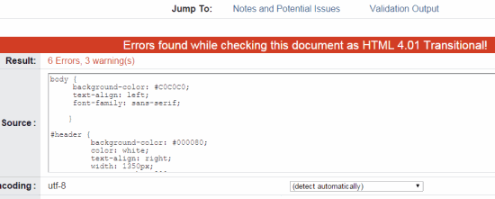 I will start the list with the CSS validator of W3C itself which is known as W3C CSS Validator. This validator supports checking CSS codes by uploading file, entering URL, or copy-pasting the code. After analyzing the CSS code, it shows the number of error(s) and warning(s), if any. The complete result is divided into 2 sections: Note and Potential Issues & Validation Output. You can go to each section to have a detailed look at the errors/warnings and to see how you can fix them.