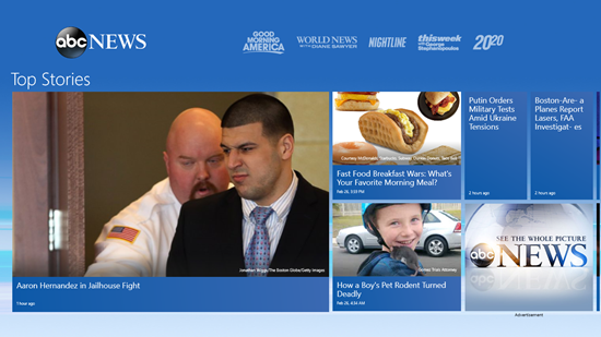 ABC News is another cool Windows 8 news app that will help you read the latest news with your hot morning cup of coffee. When you launch the app, you will be presented with pictorial tiles of news items. The news items are sorted into categories like Top Stories, Trending, Health, etc. which can be revealed by scrolling to the right side of the screen. Clicking on a news tile will open it up in a full screen view. In the news view, the font size can be adjusted via the control bar of the app. The app supports snapped view. In the main screen of the app, you can also choose the source from where the news is to be fetched at the top of the screen – whether from Good Morning America, World News With Diane Sawyer, Nightline, etc.