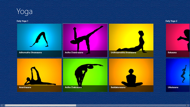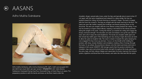 Daily Yoga for your health is another free Yoga app for Windows 8 that allows you to stay fit. When you launch the app, you will be presented with neat vector drawings of the asanas. You can click on each of these asanas to read more about performing these asanas. The clear illustrations also eliminate the need of actually reading more about the asanas by clicking on them because you can see clearly how the asanas are performed by just looking at the pictures. You can see more asanas by navigating to the right by scrolling. The app contains a total of 36 asanas. This app also works well in snapped view.