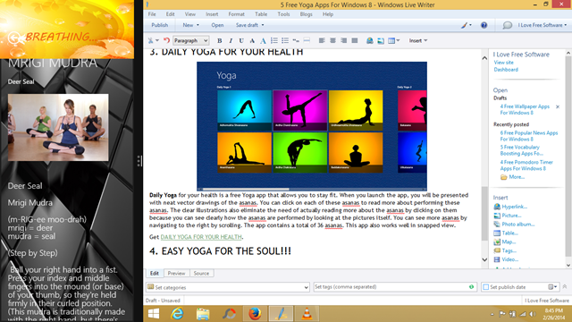 Easy Yoga For The Soul!!! is a free Windows 8 app that allows you to practice Yoga asanas by looking at your screen. The app has neat picture illustrated asanas that you can perform easily anywhere where you have access to your Windows 8 device. When you launch the app, you can see the picture illustrated tiles that show the Yoga asanas. Clicking on a particular Yoga pose will show you more information about that particular asana, and you will also be able to see the steps as to how to perform that asana. The app also works well in snapped mode (the the screenshot) and the pictures make it all the more easier to perform an asana.