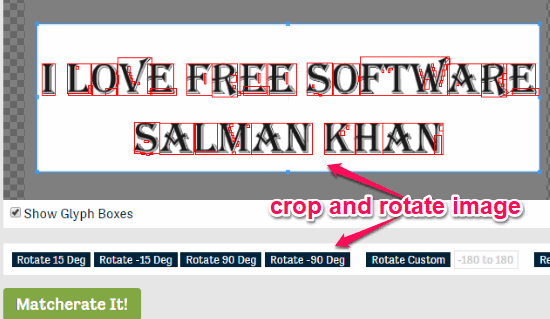 Font Matcherator is one of the best free websites to identify fonts from an image. You can simply upload an image and then it will automatically identify the font and show all the matching fonts. For better and accurate result, it also allows you to crop and rotate the uploaded image before you go ahead and identify the font.