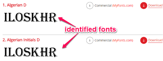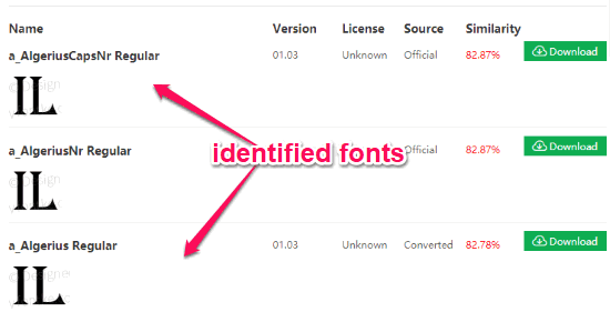 Step 3: Once done, simply click on the “Identify” button at the bottom. After you do that, it will start identifying the font and then show all the matching fonts. You will also see a download link associated with each font and the percentage of similarity with the font from the image.