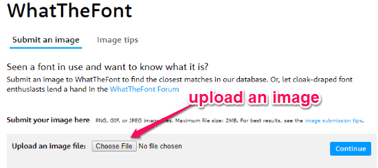Step 1: After you visit the homepage of WhatFontIs, you can go ahead and upload the source image. You can either upload the image from your PC or from an URL. After uploading the image, click on the “Continue” button to proceed. You can also enable or disable the additional attributes (like background is darker, etc.).