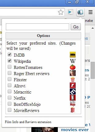 Clicking on the icon opens up a search box where you can type in the name of the movie that you’d like to look up. Don’t forget to click on the Options button and select which movie review website you’d like to search through. Once you typed in a search term and clicked Go, results are opened up in a new tab.