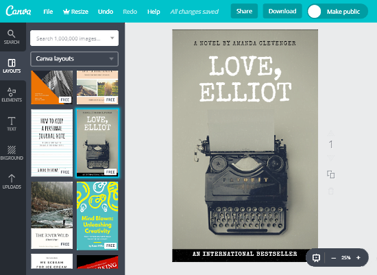 These websites offer beautiful design templates which you can use to make your book cover. After making your book cover, you can download it either PDF file or image (PNG/JPG) file in high-quality. Most of them also let you download your book cover in higher resolution as well.