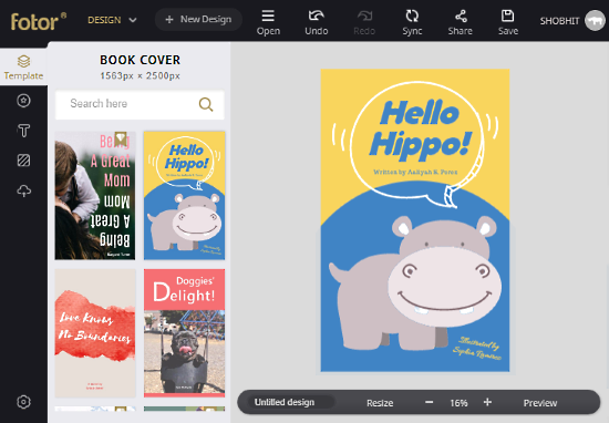 Fotor is an online photo editor and design maker. With Fotor, you can make a wide variety of designs from book covers to posters, cards, social media covers, social media posts, banners and more. Here, you can design your book cover from scratch or use one of their high-quality templates. In either case, the process of making a book cover is very easy. Along with text, you can add images, background colors, patterns, shapes and sticker to your design here. And, after making your cover, you can download it in high-quality as PNG, JPG, or PDF file.