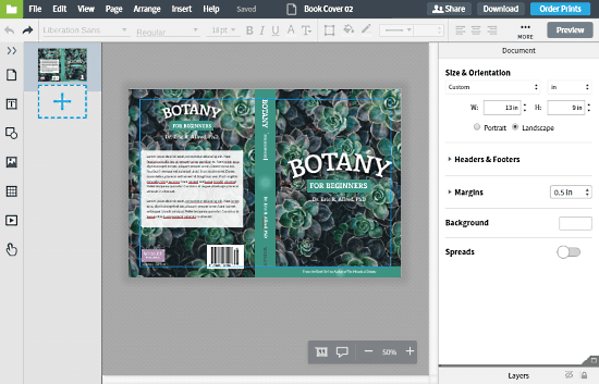 LucidPress is a web-based publishing app to create stunning graphical content for print and digital. With LucidPress, you can easily create stylish book covers, posters, business cards, flyers, brochures, newsletters, magazines, presentations and more. It offers a variety of book cover templates which you can use to get started. Here, you can make stunning book covers by adding photos, shapes, text, and even tables to your design. It gives you a fine control over the size, orientations, and dimensions of your cover.
