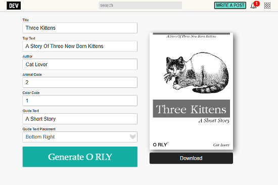 Dev.to offers an ‘O RLY Cover Generator‘, an online tool to make simple book covers instantly. It has a few text fields to enter the title, top text, author name and guide text for your cover. Along with that, it has pre-defined sets of animal images and colors. Each animal and colors in those sets have a number assigned to it. You can use any animal image and color in your cover by entering their respective numbers in the “Animal Code” and “Color Code” options. After filling these options, you can generate a cover here and download it as PNG image to your computer.