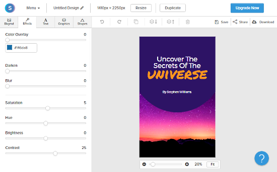 Here, you can add background, images, patterns, text, shapes and graphic icons to your cover. As Snappa is a graphics editor, it also gives you options to add photo effects to your cover which you can adjust accordingly to get desired result. After making your book cover with Snappa, you can download it as High-res PNG, Web Optimized JPG, Retina JPG or Retina PNG file. Do note that, the free users are limited to 5 downloads per months.
