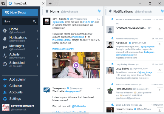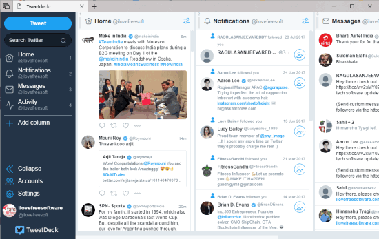 The entire interface is exactly same as TweetDeck. You can use the left sidebar to search for a Twitter account, add columns of your choice, collapse sidebar, login to multiple accounts, schedule tweets, access your Twitter messages, etc. The rest of the interface shows the items present in the columns added by you. There is no difference in options anywhere. So, you get the entire TweetDeck experience from your desktop.