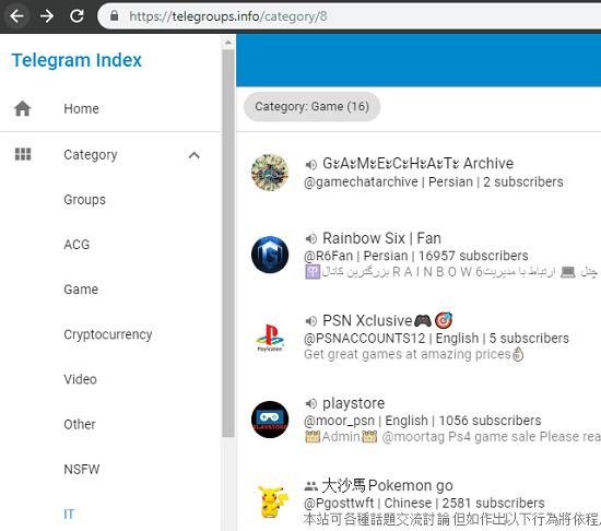 Telegram Index has a huge database of popular and non popular Telegram channels and you can search them easily. As the name indicates, this website has index of a lot of Telegram channels. And it has categorized channels in various sections for your ease. You just look for channels either by browsing them via categories. Or, you can enter a keyword to list them. Not only this, but you can search for a channel in other language as well.