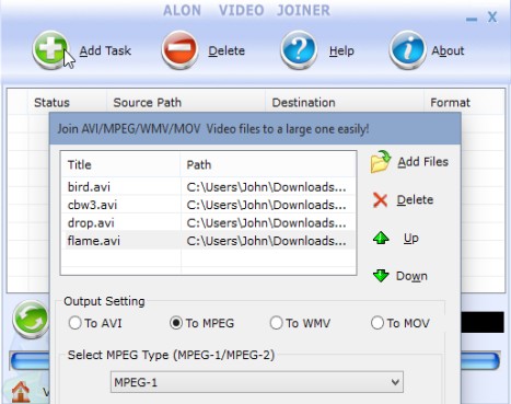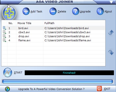 To join videos, they first have to be added to the list using the “Add Task” button. Don’t forget to tweak the order in which they’re going to be joined using the up/down arrows on the side. When you’re done with the setup click on the Start button to start joining selected videos. Output format is AVI. Be careful during install because AoA Video Joiner tries to install toolbars.