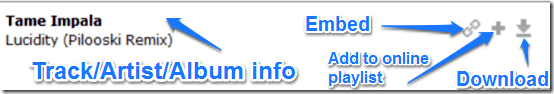Downloading a track from Epitonic is super easy. There are no sign-ups, accounts, or anything of that sort required. Simply search or browse through the vast collection to find some tunes, listen to them online, and download them if you like them. As simple as that. Each track has three small icons on the right of its title. You can use these to embed the track on your website or blog, add to the online playlist, or download it.