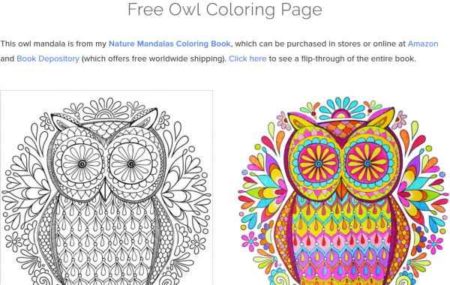 Art is Fun is a lovely website with lots of coloring pages for adults. The website looks aesthetically beautiful. The page for adult coloring can be seen in the screenshot above. The website has coloring pages divided in to different categories like owl coloring page, hippie camel coloring page, happy campers coloring page, etc. Each coloring page also has a colored example given with it, just for your guidance. This can be seen in the below screenshot.