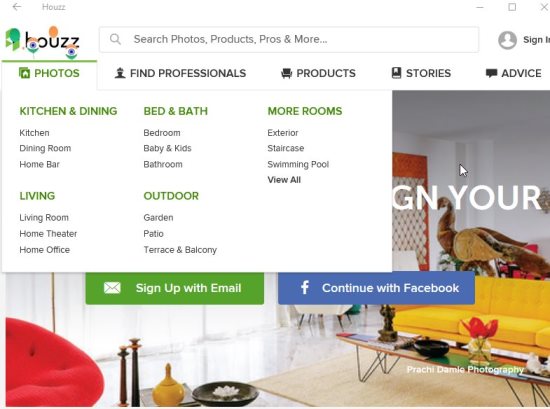 Houzz app is not exactly a app which lets you design a home, but it gives you everything you require to renovate or redecorate your home. The app has a large collection of high resolution photos of home interiors and exteriors. You can browse the photos by rooms, location, style, etc. You can even save the photos that you like and can even share the photos with your friends. When you launch the app you have the option to login either with Facebook or create an account using your email id. You can browse lots of photos in various categories like kitchen, dining, living, bath, kids, exteriors, outdoor, etc. You can also look at home decor photos as well to see what will look good in your house. The products section has all the product photos, which are also divided into categories like home decor, furniture, bathroom, kitchen, bedroom, home improvement, etc. The app also offers you professional advice through discussion groups. You can also look for professionals like architects, interior designers, etc. in your area through this app. The app might not let you design your home through a drawing, but helps you with giving you lots of ideas for home design.
