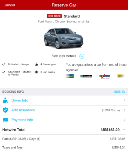 Tap on the car in which you are interested and get the detailed info about it. You can add the driver info, add insurance, payment info, etc..