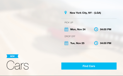 The Cars option lets you search for cars available for rental. You can search for the cars by mentioning the location, pick up date, and drop off date.
