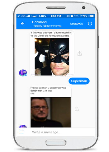 As I mentioned, you can also search for funny memes on Facebook by using this Facebook Messenger bot. You just have to send a keyword as a message to this bot and it will then return a meme. Let’s say you want a funny meme for “Batman” then you have to send Batman as a message to this bot and it will send a Batman meme, as you can see in the screenshot below.