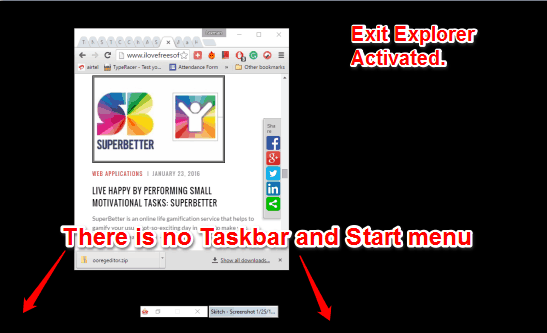 That Exit Explorer option doesn’t provide cool interface or options. Activating that Exit Explorer will disable access to Taskbar icons, Start menu, Desktop, File Explorer, etc. Only the maximized windows or windows opened in restore mode can be accessed. You don’t need to worry as you can also disable the Exit Explorer easily to get back everything.