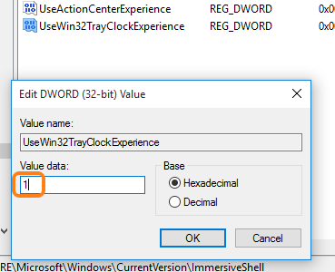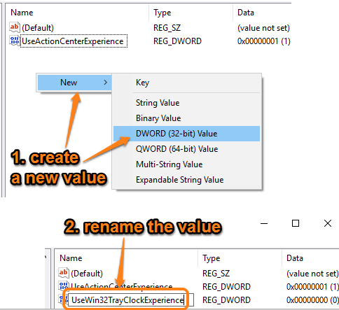 Step 4: Rename new value to “UseWin32TrayClockExperience“.