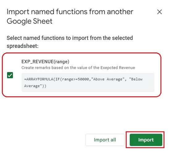 3. You will be able to view all the Named Functions in the selected Workbook. You can use the checkmarks to choose the functions that you want to import and click on the ‘Import’ button. Alternatively, you can click on ‘Import All’ to import all the functions in the Workbook. Once the import is done, you will be notified of its success.