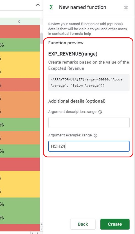 4. Provide an optional description for the function as a good practice which is very helpful for you as well as the people with whom you collaborate on this sheet.