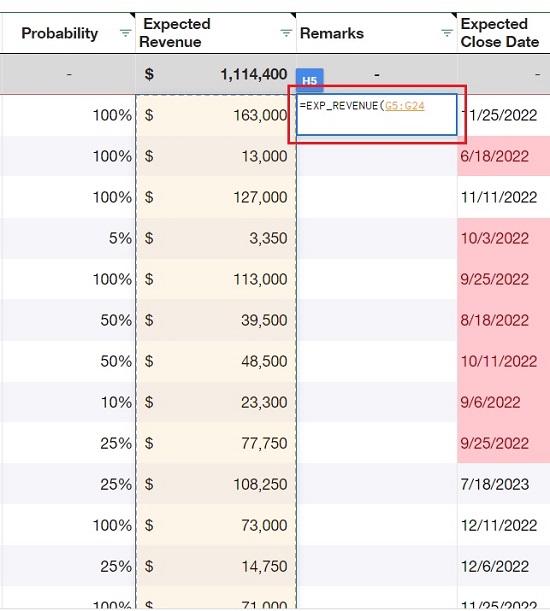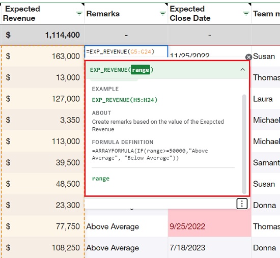 So, let’s go ahead and see how you create Named Functions in Google Sheets. We will use a sample Google Sheet as example to show you the process of creating a Named Function. In this we will create a function to apply a remark to the Expected Revenues based on some values. This example is only to explain the process of creating a Named Function. You can set up any function that you want based on your requirements.
