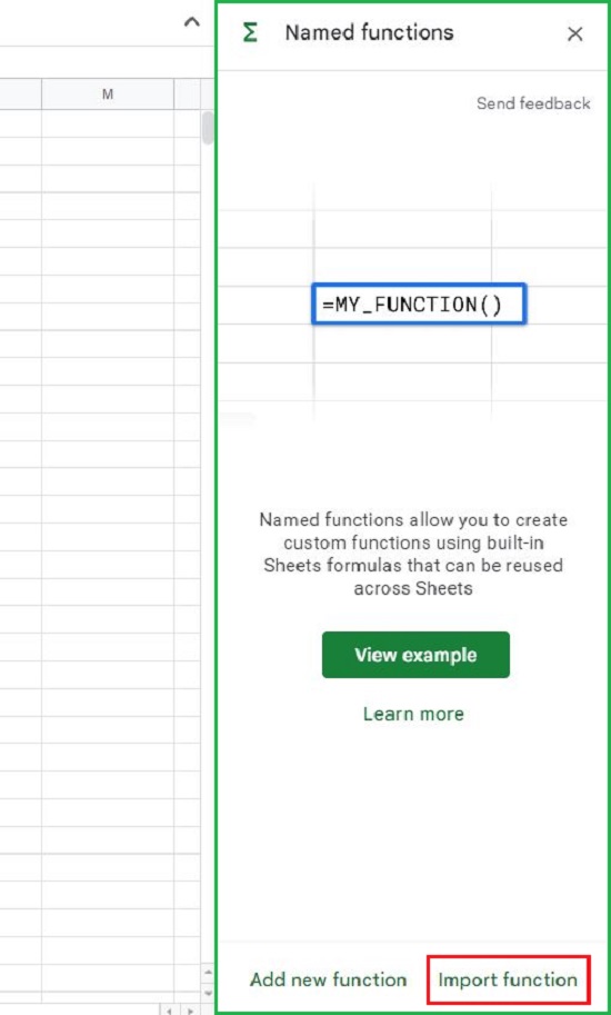1. Open another Workbook sheet. Make sure this is the one where you want to import the Named Function. Like earlier, click on ‘Data’ in the top menu and then click on ‘Named Functions’ to bring up the sidebar. Next, click on ‘Import Function’ at the bottom right.