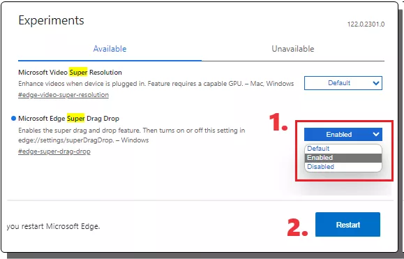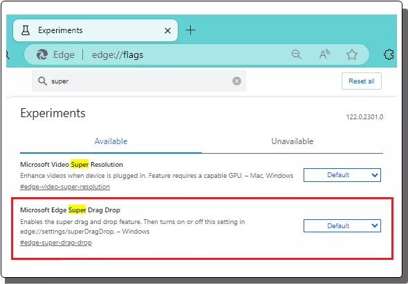 - Now search for this flag: Microsoft Edge Super Drag Drop