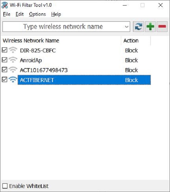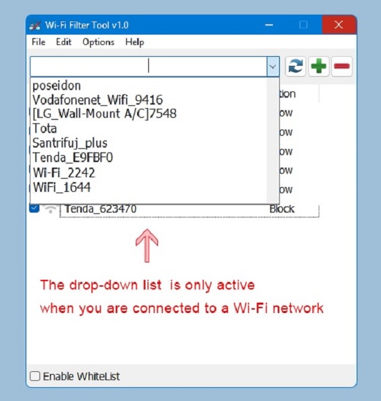 4. If you activate the ‘Enable Whitelist’ checkbox at the bottom left, only the SSID names which you have allowed will appear in the available wireless network list.