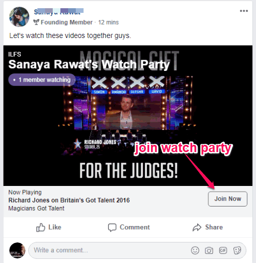 Now, you must be thinking how the group members get access or join your Watch Party. Well, this is pretty simple as when you submit the “Watch Party” post, all the group members can see the post with a “Join Now” button on the group’s timeline. When they click on it, they will automatically join the party and start watching the videos with you. Apart from that, you can manually invite others to join by clicking on the “Invite” button visible at the bottom of the “Watch Party” screen.