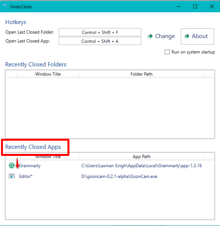 Step 3: You can use those hotkeys or change them with your custom hotkeys. When you have done that, close the window, and the software will start running in the system tray. Now whenever you will close a folder or program accidentally, you can open it in a flick.