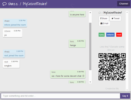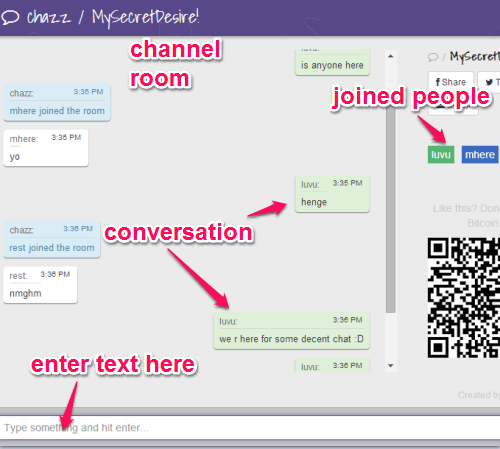 In above screenshot, you can see a secret channel created by me using this anonymous chat website. You can come back to your channel or lobby anytime, but no conversation will be visible to you. That’s what it is meant for.