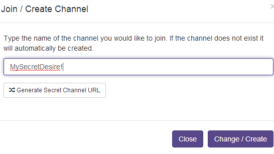 To create your own channel using this anonymous chat website, go back to its homepage. Now click on Change/Create Channel button. A pop up box will open in front of you. See the screenshot below. In this pop up, you need to enter a name for your channel or anonymous chat room. Channel name could be anything, depending on your creativity. If you want, you can also use Generate Secret Channel URL button to create a random name for your channel.