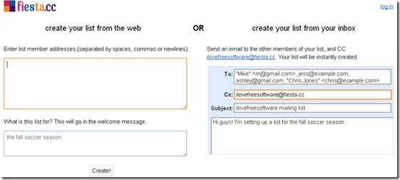 Fiesta.cc is a free web application to create email group to send group email. You can add members to email groups, and create private mailing lists. You can specify members of your group, and create as many mailing groups as you want. Once your email group is created, you can send group mails to them. All the members of the group can manage the mailing list.