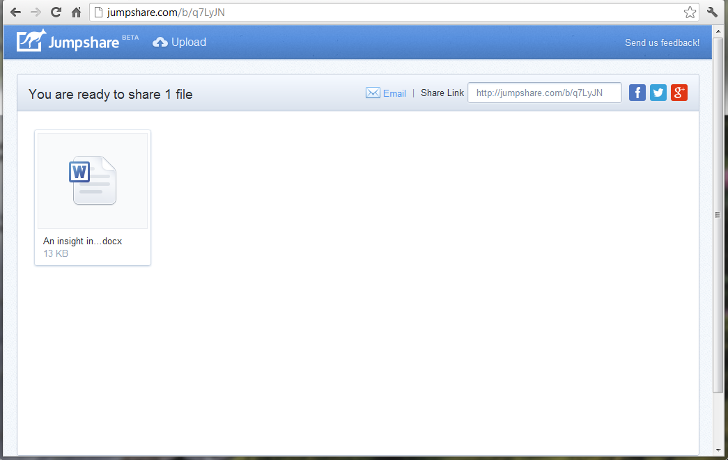 Whenever you want to share any file, you have to visit Jumpshare and select the required file through its ‘select files to share’ option. Once the file is uploaded on Jumpshare, you can share it on Facebook, Twitter or Google+. The recipient with whom you have shared the link can view it whenever he/she wants to. More importantly, the recipient does not have to sign-in to any of his accounts, keeping in mind security of his/her privacy too.